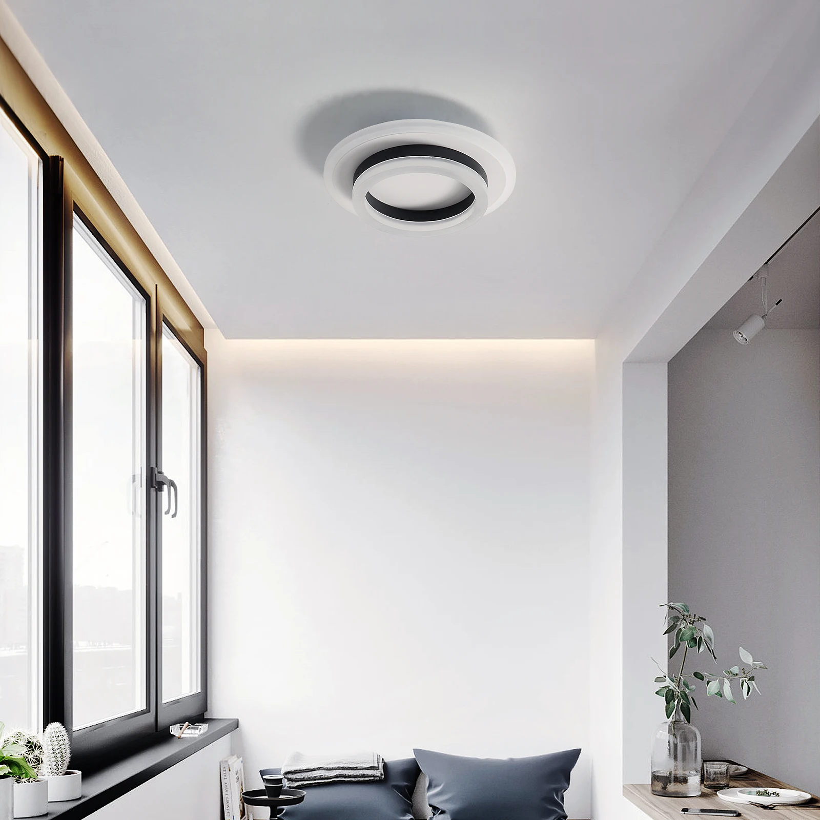 Minimalizm w czystej formie. Model Vetro to kompaktowa oprawa sufitowa, która udowadnia, że mniej znaczy więcej. Jej design opiera się na idealnym kole, podkreślonym subtelnym kontrastem bieli i czerni, co nadaje jej nowoczesnego, świeżego charakteru. Dzięki niewielkim wymiarom (średnica 20 cm) i smukłemu profilowi, plafon ten doskonale sprawdza się w mniejszych pomieszczeniach, gdzie liczy się każdy centymetr przestrzeni. To oświetlenie, które nie narzuca się swoją obecnością, lecz wypełnia wnętrze krystalicznym blaskiem, idealnie pasując do sypialni, przedpokoju czy nowoczesnej kuchni.