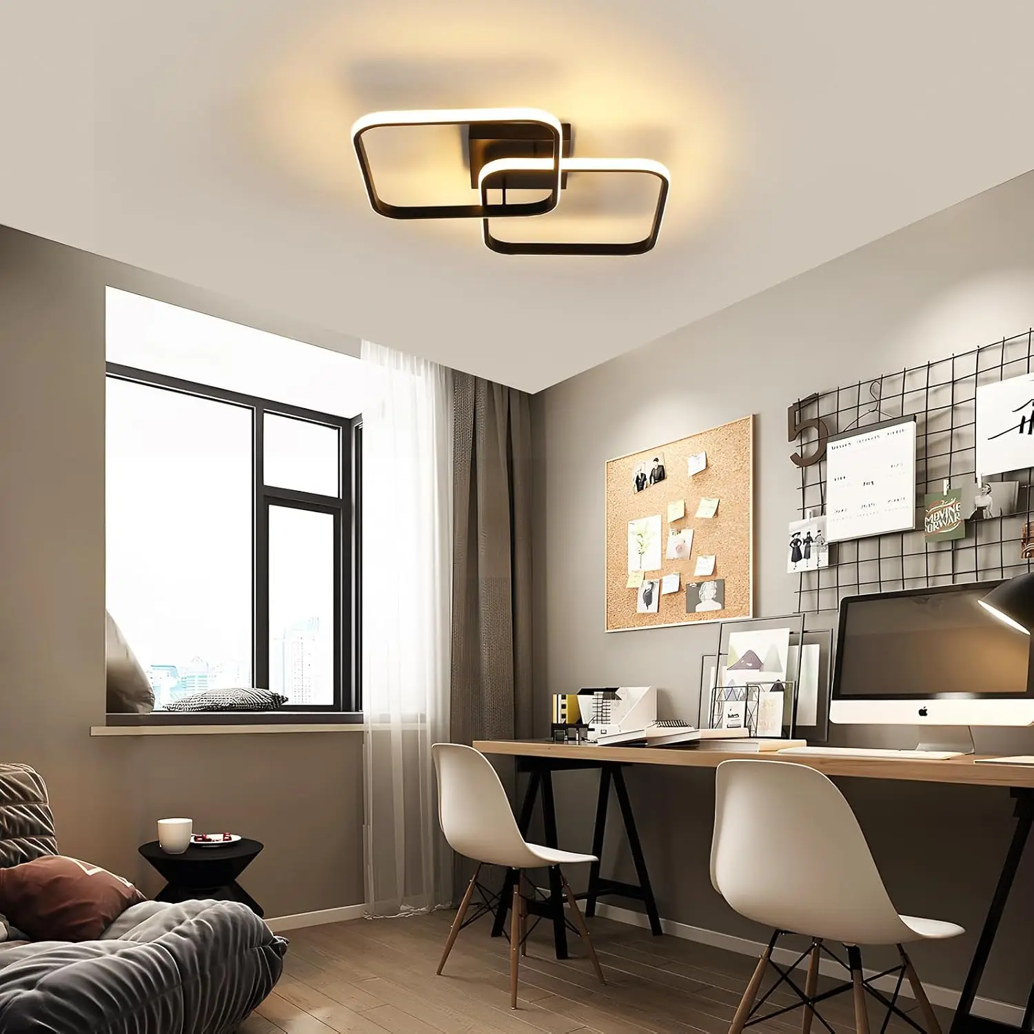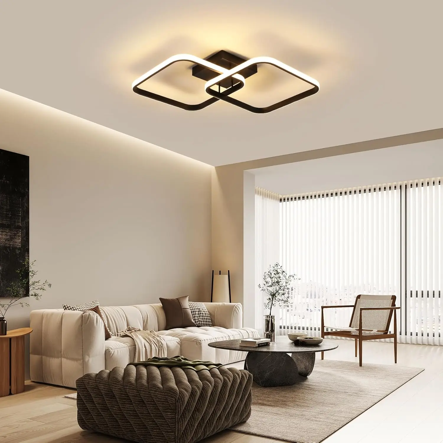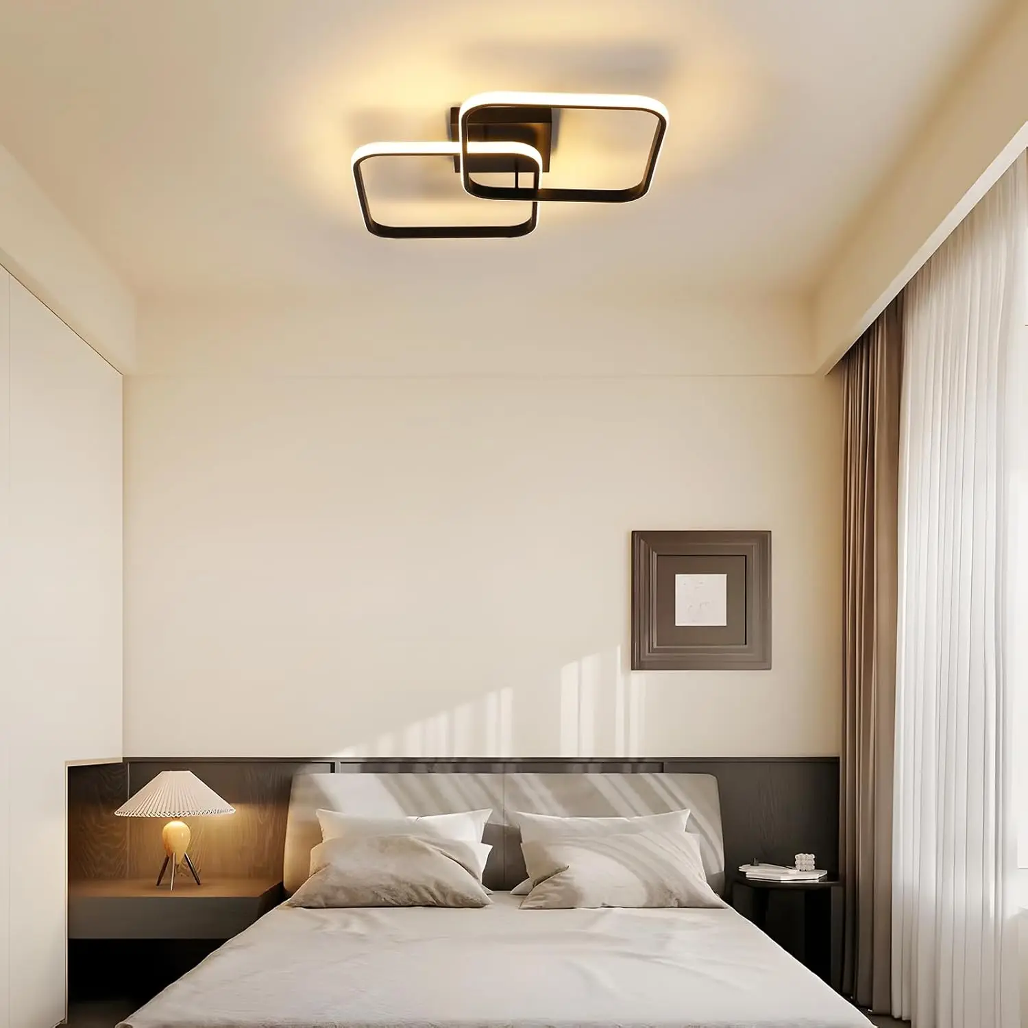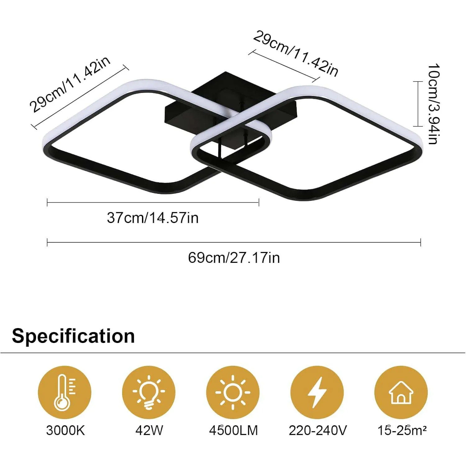 • Geometryczna rzeźba 3D: Nakładające się na siebie czarne ramy tworzą dynamiczną formę, która zmienia swój wygląd zależnie od perspektywy. Szeroka rozpiętość lampy (69 cm) pozwala efektownie zagospodarować przestrzeń na suficie.
