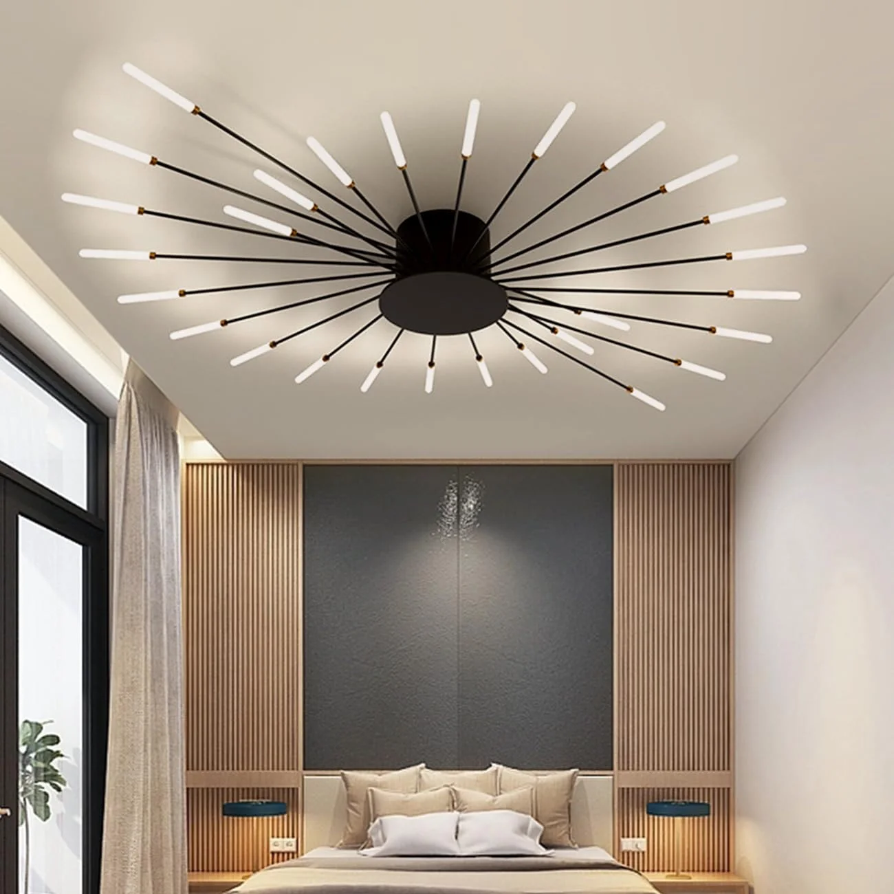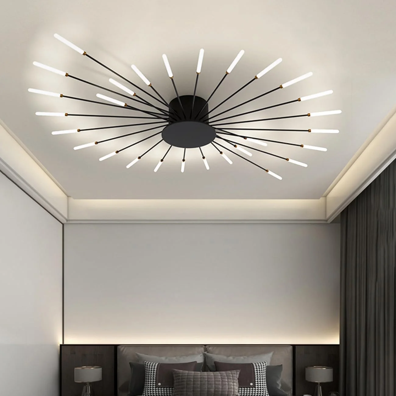 Spektakularny rozbłysk w Twoim wnętrzu. Nova to plafon sufitowy, który całkowicie zmienia postrzeganie przestrzeni dzięki swojej gigantycznej, 105-centymetrowej rozpiętości ramion. Projekt zainspirowany widowiskowym wybuchem fajerwerków łączy surowość czarnego żelaza z delikatnością licznych punktów świetlnych. To model stworzony dla osób, które szukają oświetlenia o dużej skali, potrafiącego wizualnie wypełnić wysoki salon, sypialnię czy przestronny hol. Dzięki neutralnej barwie światła (4500K), lampa Nova wprowadza do pomieszczenia naturalną jasność, która nie przekłamuje kolorów i sprzyja codziennej aktywności.