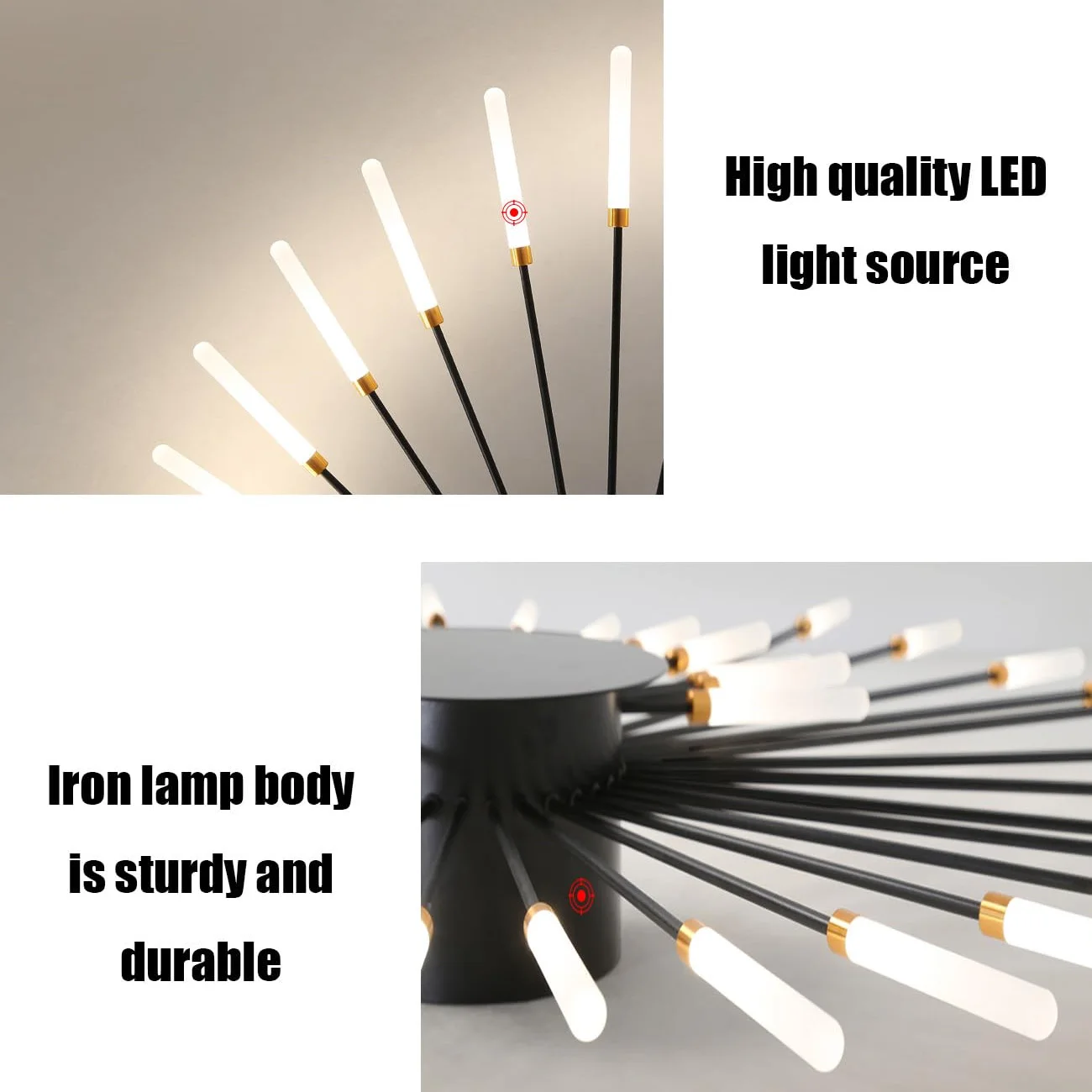 Solidna konstrukcja z kutego żelaza: Mimo delikatnego wyglądu, szkielet lampy wykonany jest z wytrzymałego żelaza malowanego proszkowo. Zintegrowany system LED zapewnia energooszczędność (tylko 28W) przy jednoczesnym uzyskaniu szerokiego kąta świecenia.