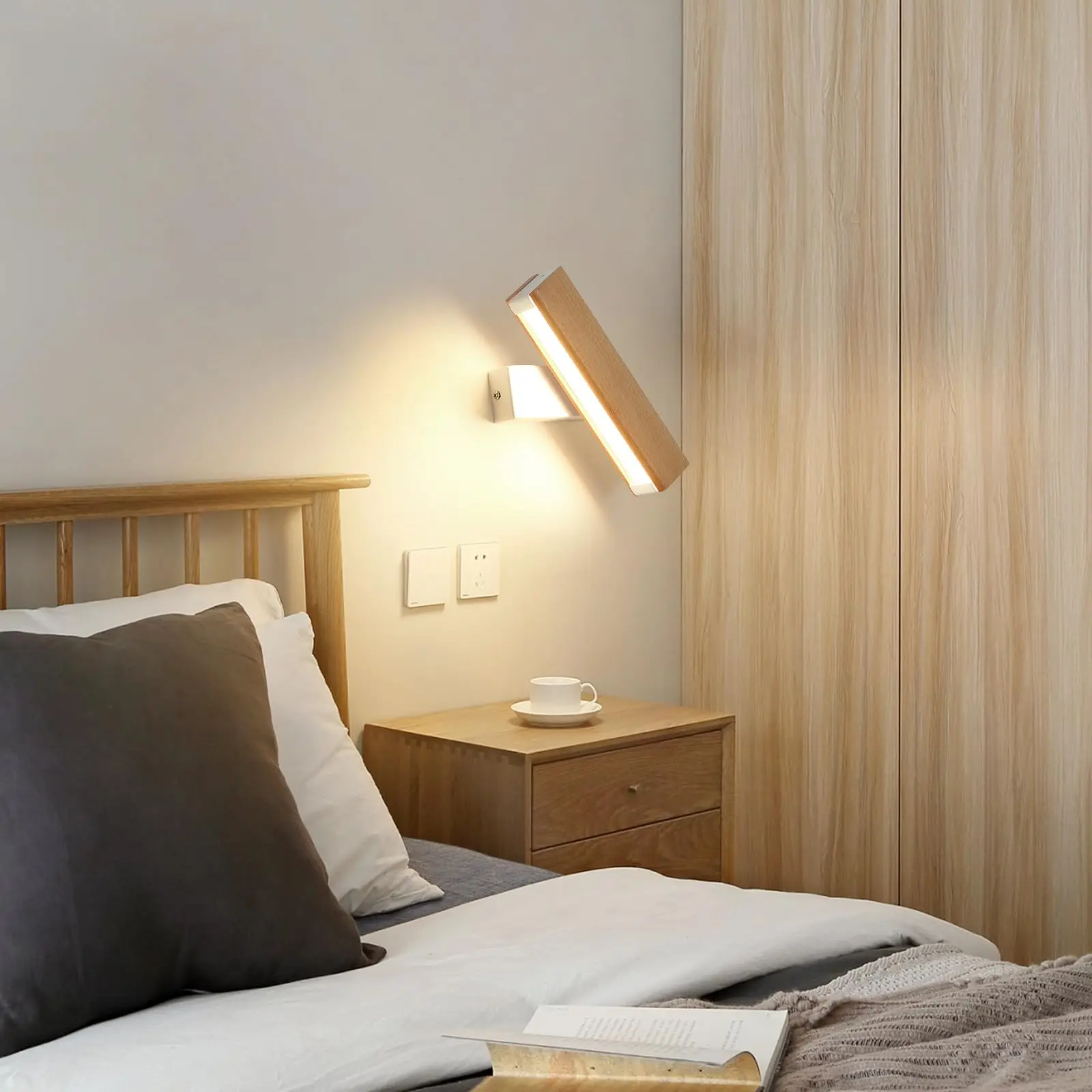 Natural warmth in full rotation. Roto is a wall lamp that combines the raw appeal of solid wood with modern lighting technology. Its unique design allows for a full 360° rotation of the body, allowing you to decide whether the lamp should serve as an atmospheric wall light or a precise bedside reading lamp. Crafted with meticulous attention to detail, from smoothly sanded wood and an acrylic shade, this wall lamp brings a sense of calm and organic style to the bedroom. Its minimalist form and warm 3000K glow make it an ideal choice for lovers of eco-friendly aesthetics and modern, cozy interiors.