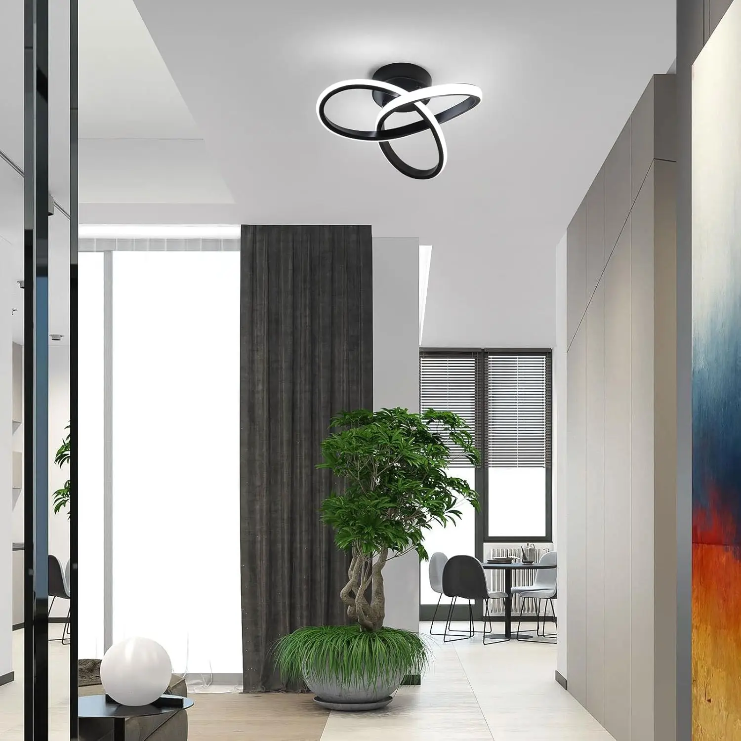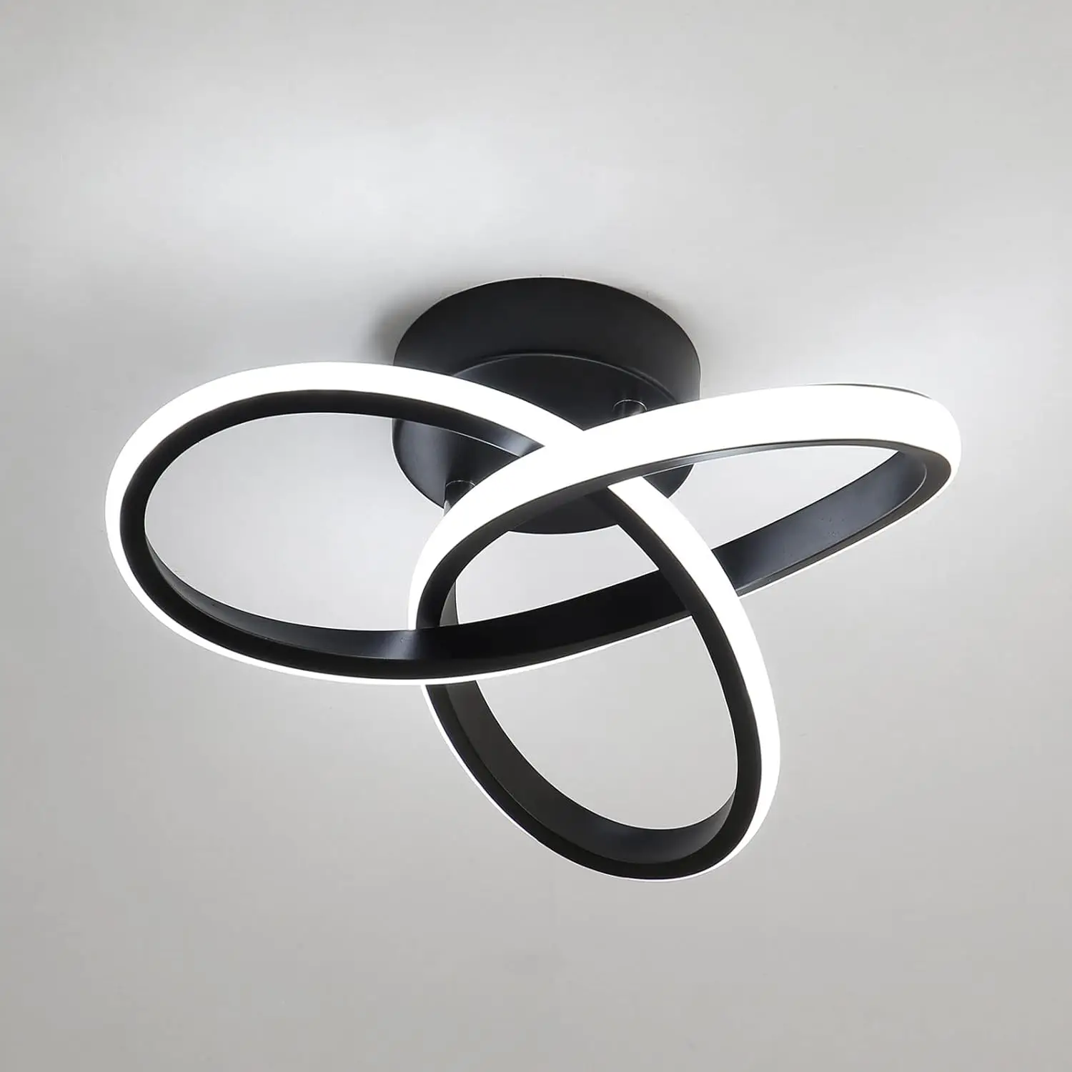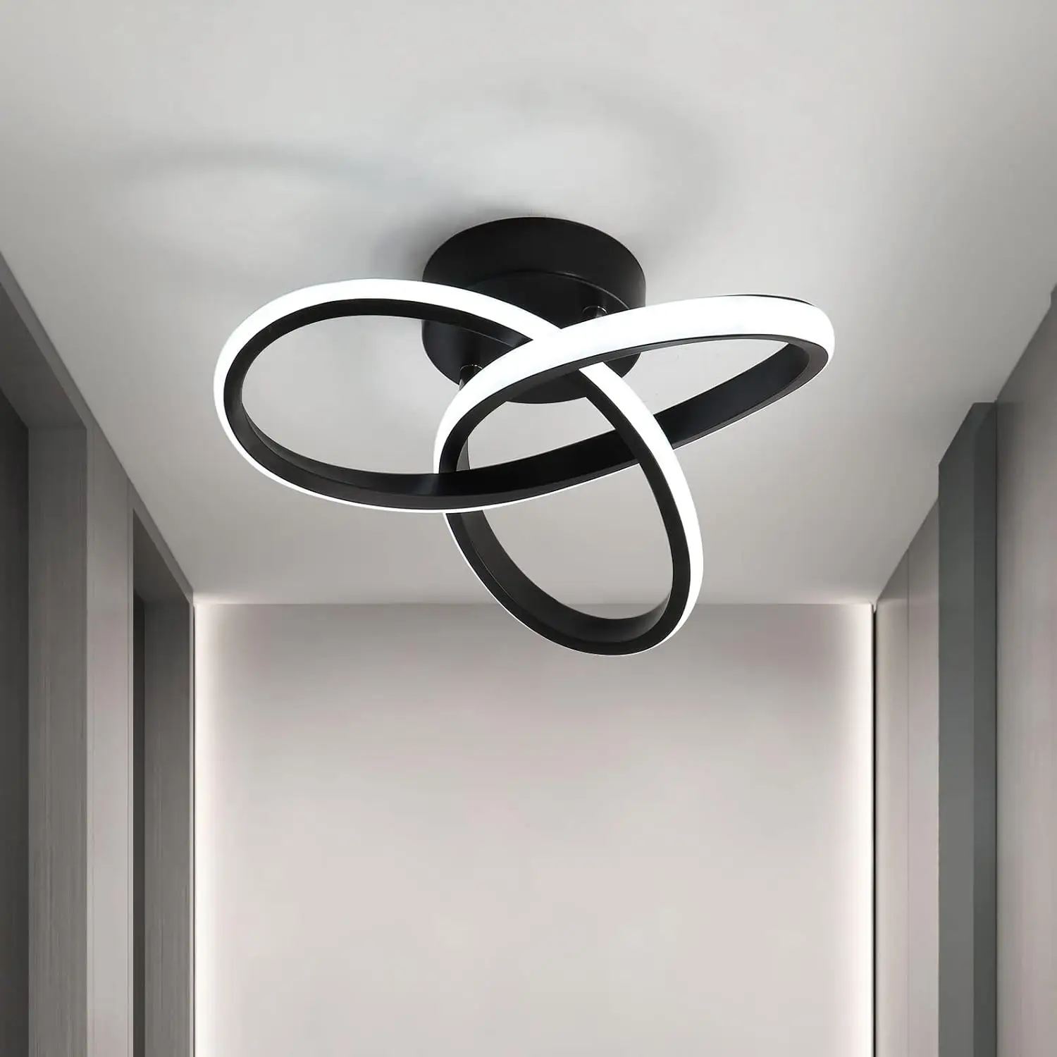 The energy of swirling light. The Vortex is a compact ceiling lamp, measuring 24-26 cm in diameter, proving that modern design doesn't need enormous dimensions to dominate a room. Its unique form, reminiscent of a dynamic, luminous weave or flower, brings movement and modern elegance to the room. The black iron and aluminum housing provides a striking contrast to the light-colored silicone shade, which softly envelops the light source. It's an ideal solution for smaller spaces, such as hallways, walk-in closets, or smaller bedrooms, where the Vortex becomes a small yet striking work of applied art.