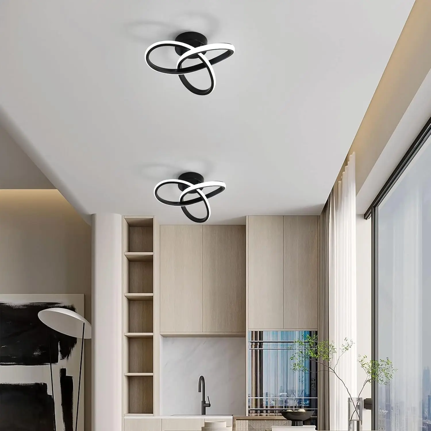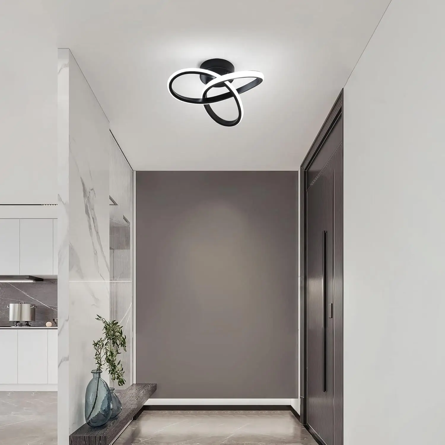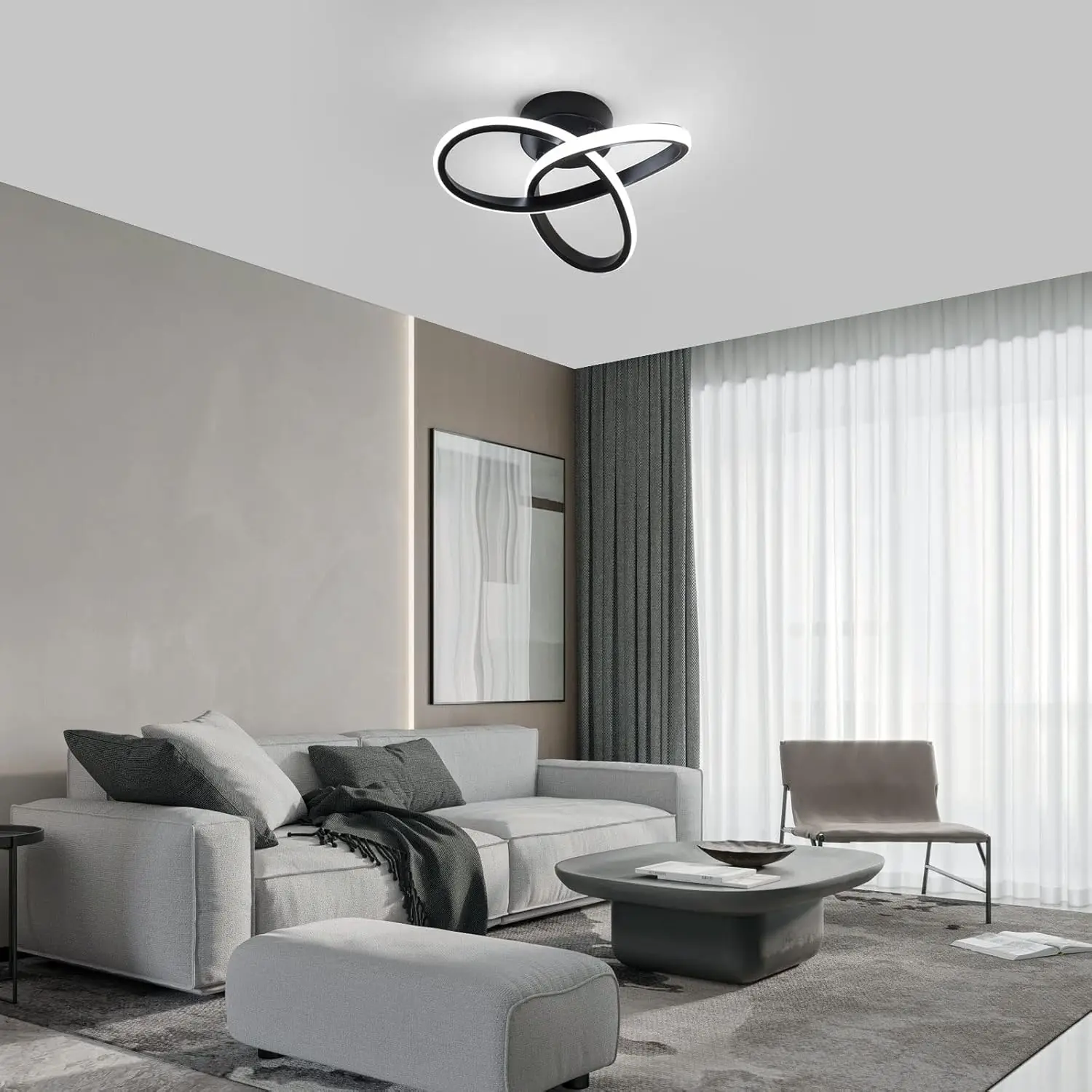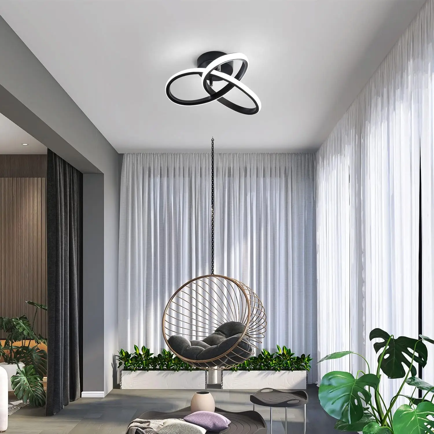 The energy of swirling light. The Vortex is a compact ceiling lamp, measuring 24-26 cm in diameter, proving that modern design doesn't need enormous dimensions to dominate a room. Its unique form, reminiscent of a dynamic, luminous weave or flower, brings movement and modern elegance to the room. The black iron and aluminum housing provides a striking contrast to the light-colored silicone shade, which softly envelops the light source. It's an ideal solution for smaller spaces, such as hallways, walk-in closets, or smaller bedrooms, where the Vortex becomes a small yet striking work of applied art.