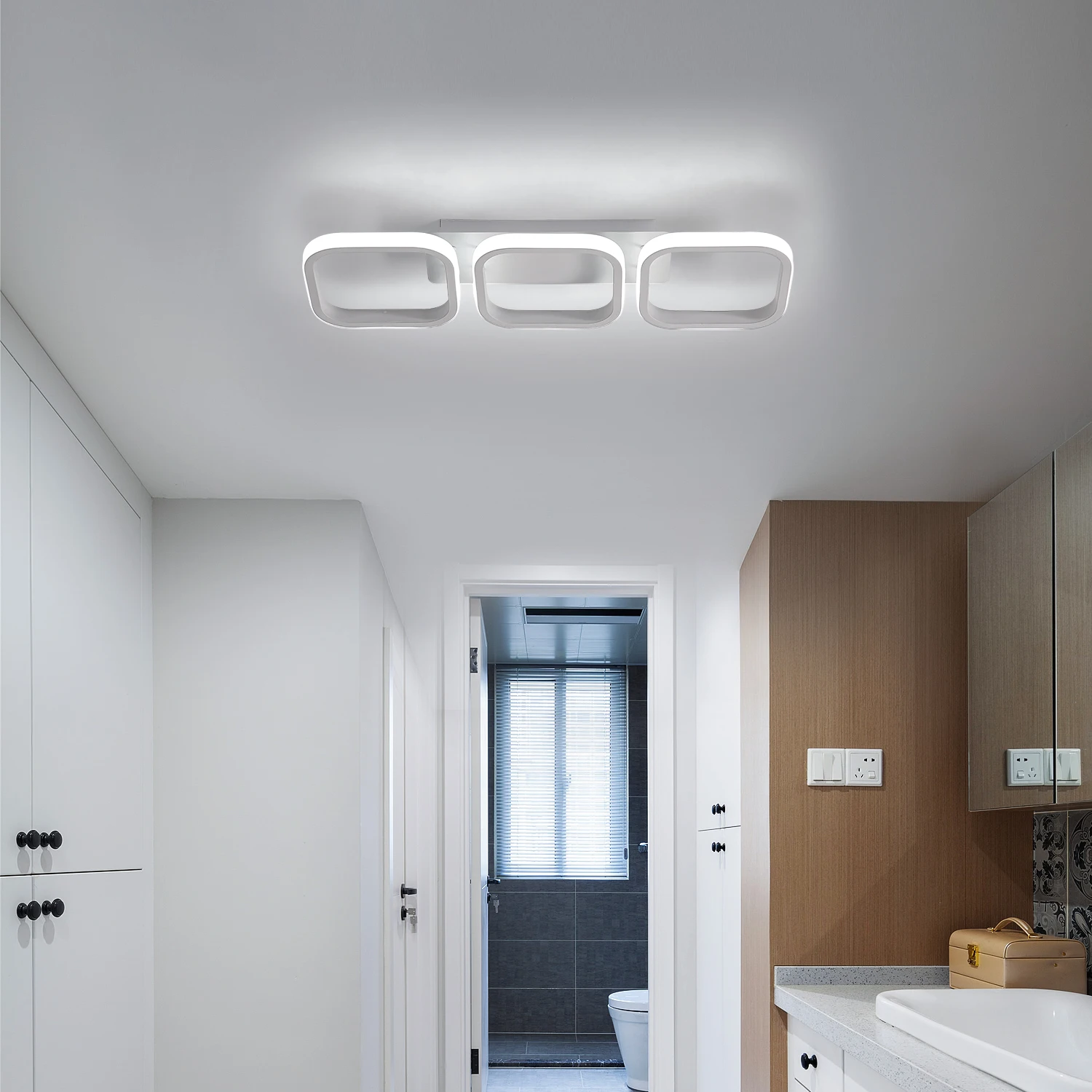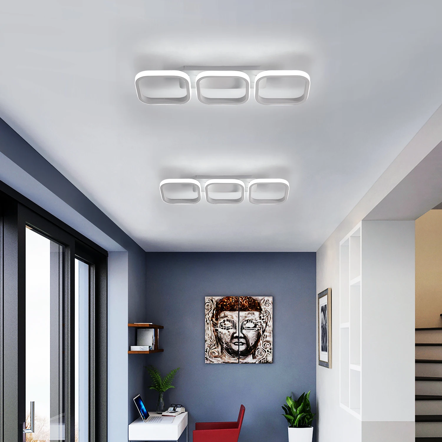 The rhythm of modern geometry. The Trio Parallel model is an impressive ceiling fixture, measuring a full 78 cm in length, that introduces architectural order and symmetry to the interior. Its design, based on three square modules arranged in parallel, creates a unique, horizontal pattern that visually organizes the space. The snow-white finish allows the lamp to blend seamlessly with the ceiling, revealing its geometric nature when turned on. It's an excellent choice for spacious kitchens, modern dining rooms, or long hallways where a wide and striking light source is needed.